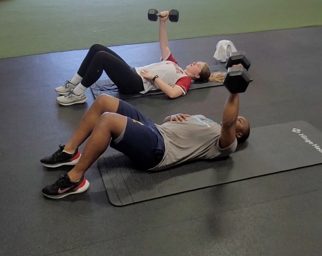 Floor Press is a great option as a compound upper body movement because in relation to a more traditional bench press, it is safer on the shoulder and elbow joints. It also targets the chest and triceps more as a result of the limited range of the exercise!